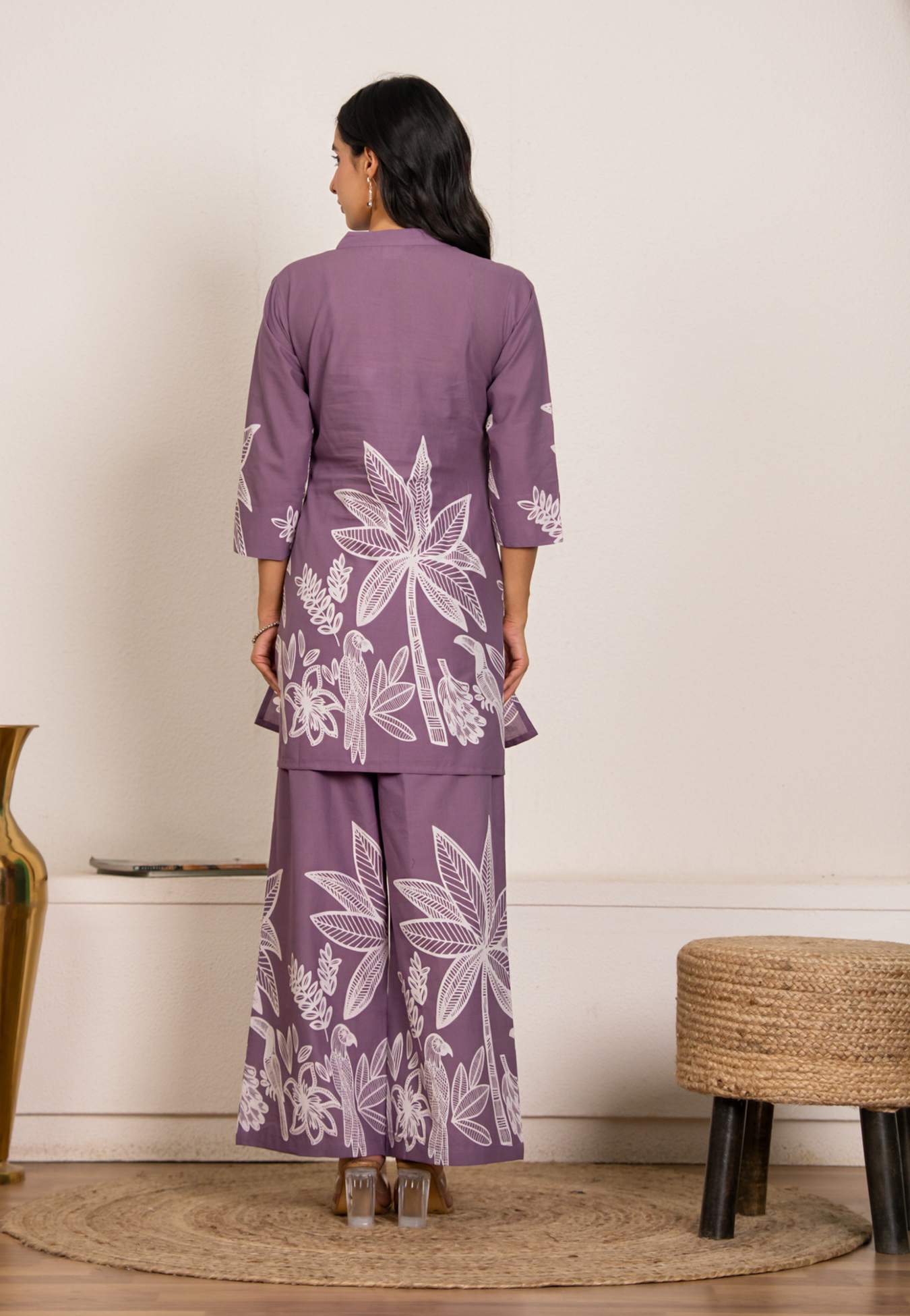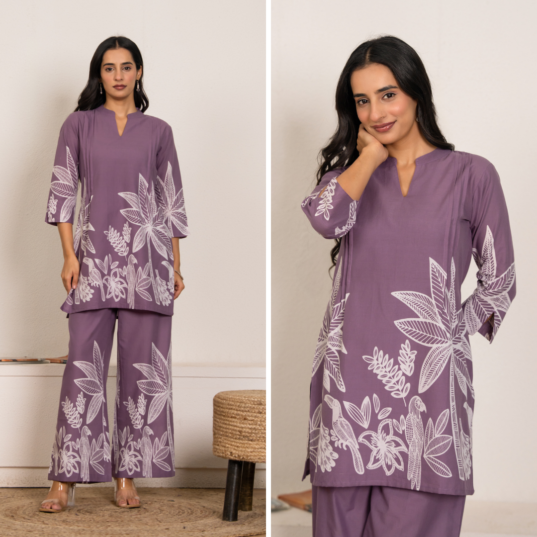 Soft and breathable cotton co-ord set in a soothing lilac shade, featuring an elegant palm tree print. Designed for all-day comfort with a relaxed yet polished fit, making it ideal for lounging, casual outings, or effortless everyday wear